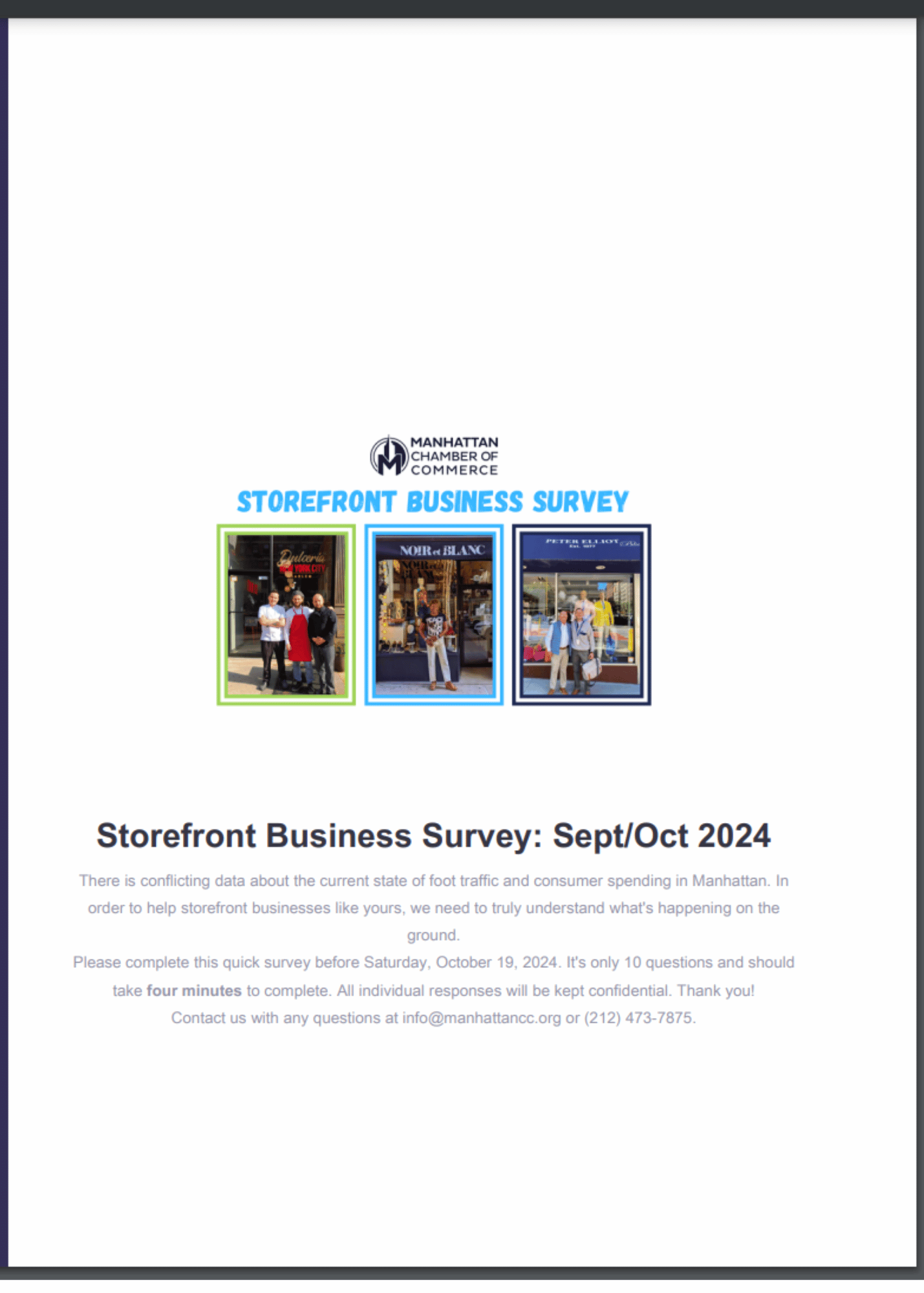 In September/October 2024 the Chamber surveyed 264 storefront businesses (retail shops, restaurants, etc.) in Manhattan. The vast majority of the businesses surveyed had 10 or fewer employees. Major findings include: